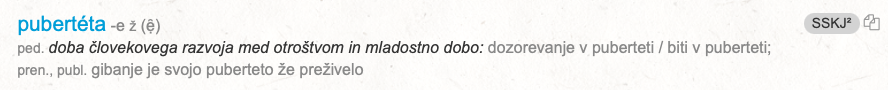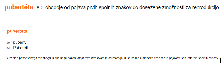 Vprašanje:Zanima me, če je beseda puberteta obravnava kot termin, glede na to da je v slovarskem sestavku ne najdemo v terminološkem gnezdu, ampak ima le posamezne kvalifikatorje pred razlagami?